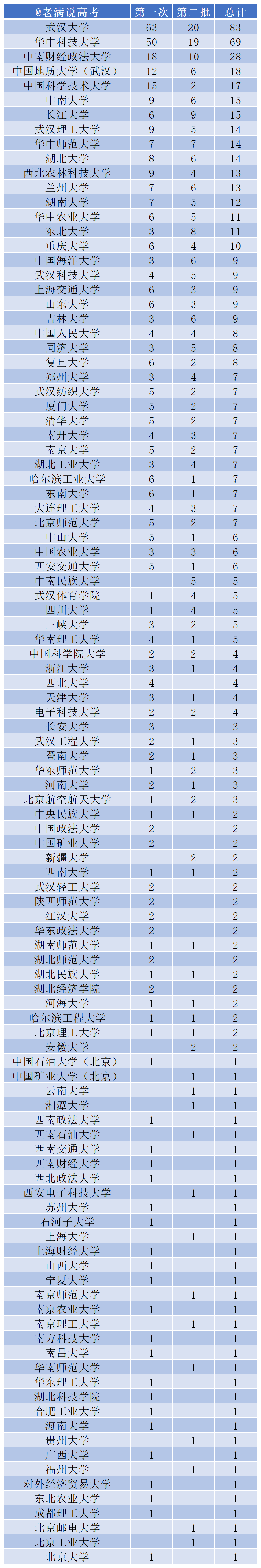 中南财经政法大学以28人位列第三,中国地质大学(武汉)18人,中科大17人,中南大学和长江大学各15人。接下来是武汉理工大学、华中师范大学、湖北大学各14人,西北农林科技大学和兰州大学各13人,湖南大学12人。
