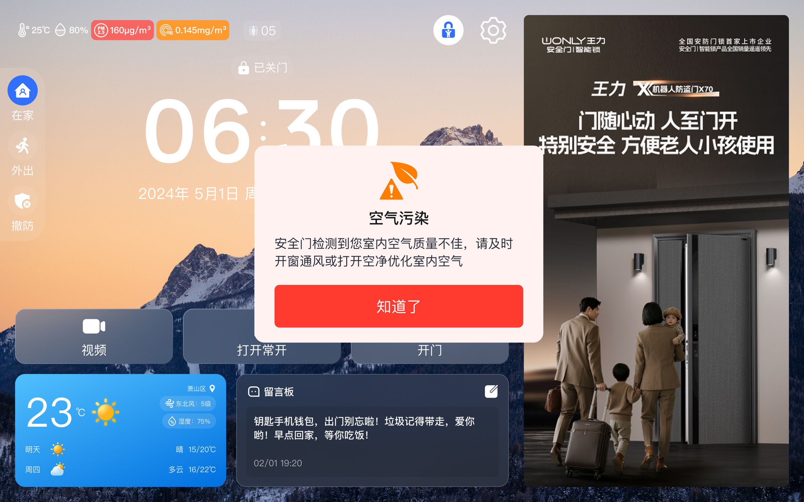 王力安防行业首创的甲醛哨兵监测技术,将高精度甲醛传感器与智能门锁产品深度集成,利用入户门24小时在线的特性,构建从监测到预警再到联动净化的健康防护体系。其通过高精度传感器全天候精准监测甲醛、PM2.5、温度、湿度等环境指标,当室内甲醛浓度超过0.08mg/m³、PM2.5大于75ug/m³时,系统会通过智能大屏与手机APP弹窗报警。更支持联动全屋新风系统、空气净化器、智能门窗等设备,自动改善室内空气质量,通过将环境感知与安防系统深度耦合的设计,让隐形污染变得可见、可防、可控。