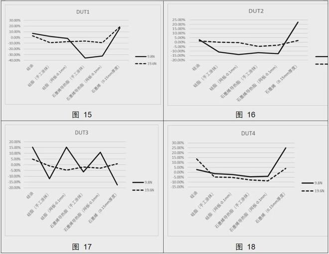0.15mm厚度石墨烯和硅油的表现次之,偏移百分比最高分别达到19.06%和25.09%。虽然这两种材料的数据偏差相对较大且稳定性稍逊,但在特定应用场景下仍具有一定的应用价值。