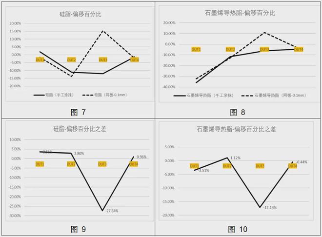 首先,我们关注的是9.8N压力下的测试情况。图7和图8分别展示了硅脂和石墨烯导热脂在两种涂抹方式下的偏移百分比。实线代表手工涂抹,虚线mm网板控制厚度涂抹。从这两张图中,我们可以直观地看到不同涂抹方式带来的差异。