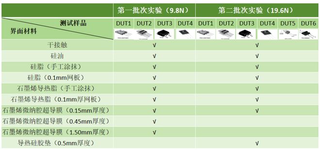实验根据施加压力的不同,分为两个批次进行,其中第一批次实验压力为9.8N,共进行了四颗待测样品的测试,第二批次实验压力为19.6N,共进行了六颗待测样品的测试。我们来看一下表1,横轴即我们本次实验用到的测试样品,此次实验测试样品的选型集中在了常见的半导体器件上,包含MOSFET、IGBT以及二极管,均为TO封装器件,一共选择了6颗样品。纵轴是我们实验中所用到的界面材料,整个实验共涉及10种界面情况。其中干接触,也就是器件直接放置在冷板上,此次实验双界面材料之一固定为干接触,其余界面材料,分别与干接触进行双界面分析。(在后文中,“石墨烯微纳腔超导膜”简称为“石墨烯”。)