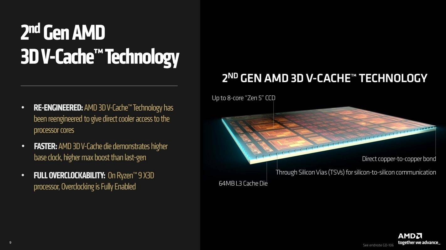 在上一代产品中,3D缓存被堆叠在计算核心之上,虽然带来了巨大的L3缓存容量,但也像给核心盖了一层棉被,在一定程度上积热不仅限制了频率的攀升,也让超频成为一种奢望。