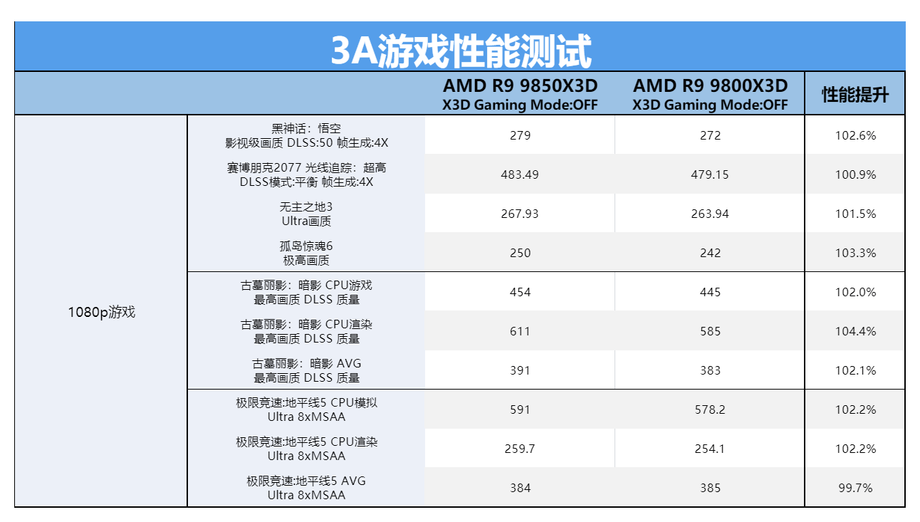 在涵盖了《赛博朋克2077》《黑神线A大作的综合测试中,锐龙7 9850X3D展现出了碾压性的优势。