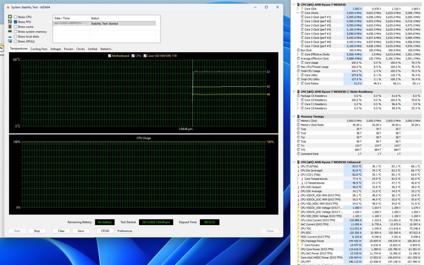 很多人担心第二代3D V-Cache和超频解锁会带来功耗、发热失控,但实际测试结果让人惊喜。满载游戏状态下,整机功耗基本维持在320~350W区间,CPU封装功耗最高也就145W左右,远低于非X3D的高频型号。温度方面,360mm水冷压住全核5.1GHz,最高温度也仅83℃,日常游戏负载更是常年徘徊在70℃以下。
