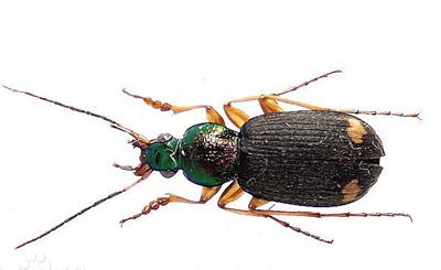 青步甲(Isiocarabus fiduciarius),成虫体长16毫米左右。头部、前胸背板深绿色,具光泽,前胸背板两侧缘赤褐色。鞘翅黑色,微带绿色光泽。触角、上唇、颚须、唇须以及足赤褐色,上颚黑褐色,腹面棕褐色。头部额和唇基表面平整,刻点稀少,头顶刻点较多。复眼黑褐色,突出。